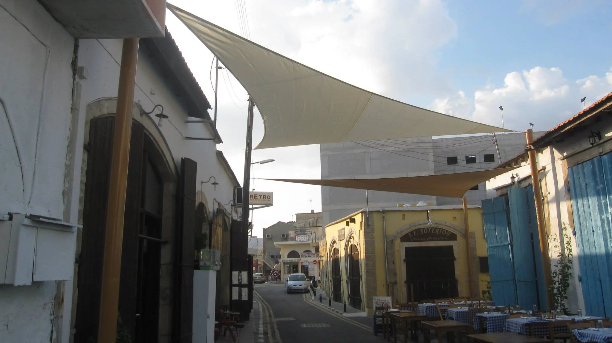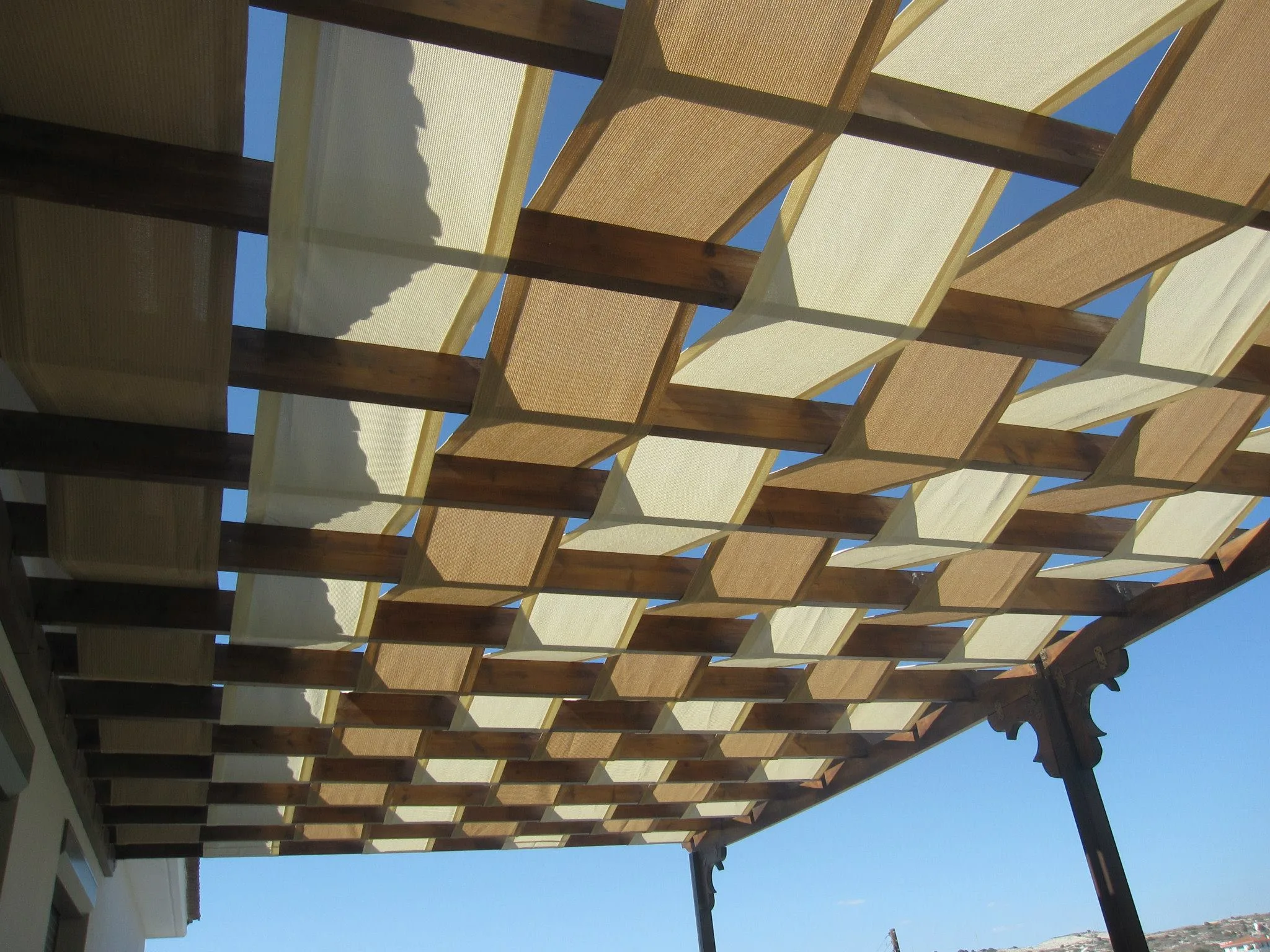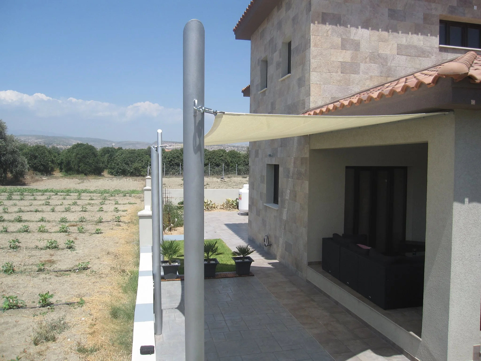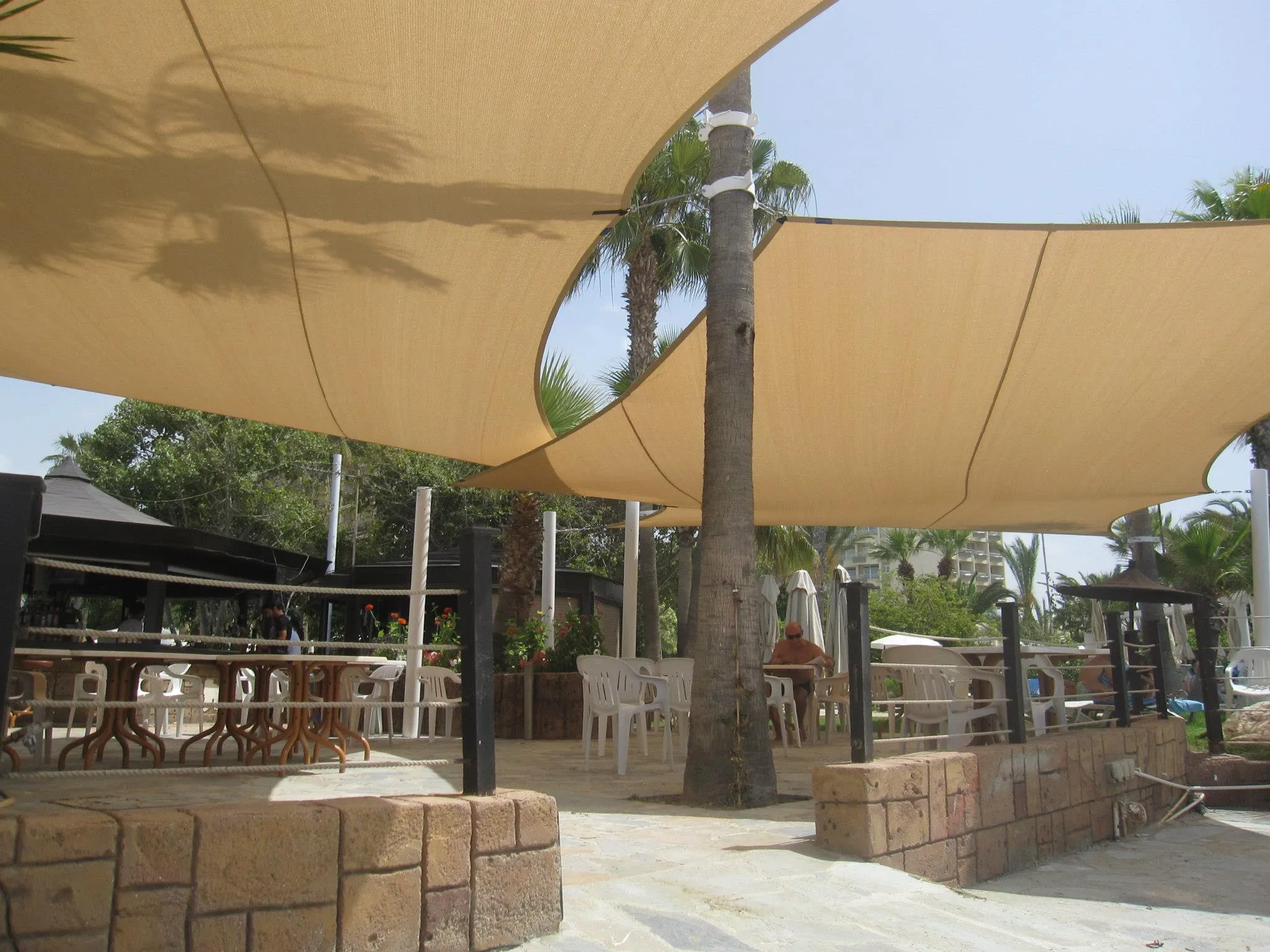 EZY SHADE Ezy shade offer a cost effective and attractive alternative to solid roof structures and are up to 10 degrees cooler due to the highly tensioned fabric being allowed to breathe. They can be the perfect application for most sun problem areas experienced in entertainment areas, swimming pools, playgrounds, parks, learning institutions, hotels clubs, restaurants, nurseries and car parks just to name a few. Made from polymer weave – extremely strong and durable fabric with tiny holes Provide 90% protection against UV rays. Tiny holes allow a certain amount of hot air to escape, making them very comfortable to sit under in the heat.